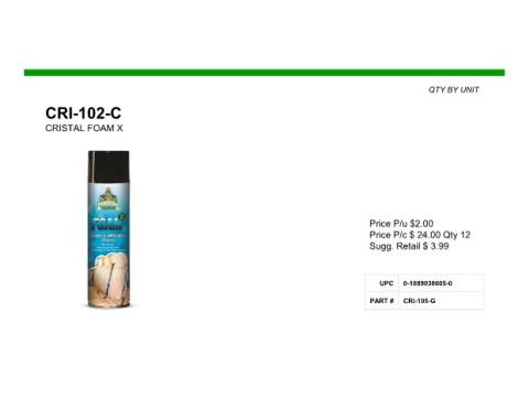 QTY BY UNIT CRI-102-C CRISTAL FOAM X Price P/u $2.00 Price P/c $ 24.00 Qty 12 Sugg. Retail $ 3.99 UPC 0-1889038605-0 PART # CRI-105-G
