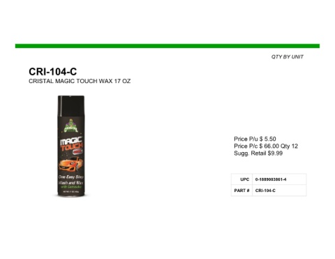 QTY BY UNIT CRI-104-C CRISTAL MAGIC TOUCH WAX 17 OZ Price P/u $ 5.50 Price P/c $ 66.00 Qty 12 Sugg. Retail $9.99 UPC 0-1889003861-4 PART # CRI-104-C