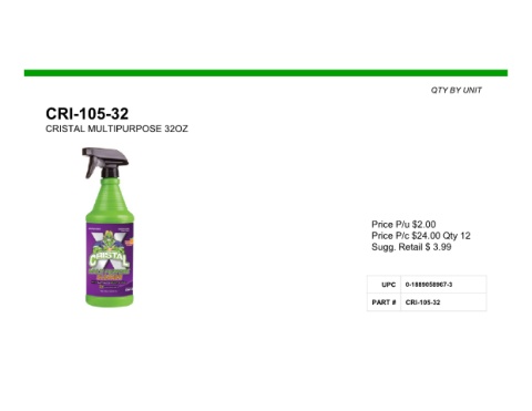 QTY BY UNIT CRI-105-32 CRISTAL MULTIPURPOSE 32OZ Price P/u $2.00 Price P/c $24.00 Qty 12 Sugg. Retail $ 3.99 UPC 0-1889058967-3 PART # CRI-105-32