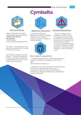 Cymbalta (duloxetine) is a selective serotonin and nor- -Major Depressive Disorder constipation,diarrhea, - The use of MAOIs with