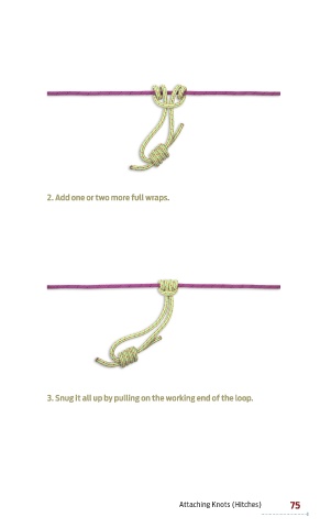 2. Add one or two more full wraps. 3. snug it all up by pulling on the working end of the loop. Attaching Knots (Hitches) 75 BPM_OutdoorKnots_4pp.indd 75 8/30/10 2:40 PM