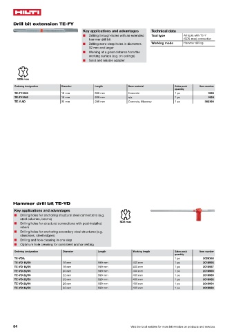 ■ Drilling extra-deep holes in diameters Working mode Hammer drilling tion and other services Tool type All tools with TE-Y