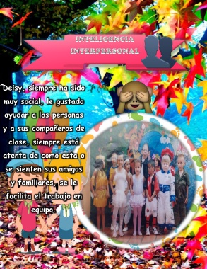 Deisy, siempre ha sido muy social, le gustado ayudar a las personas y a sus compañeros de clase, siempre está atenta de como esta o se sienten sus amigos y familiares, se le facilita el trabajo en equipo.