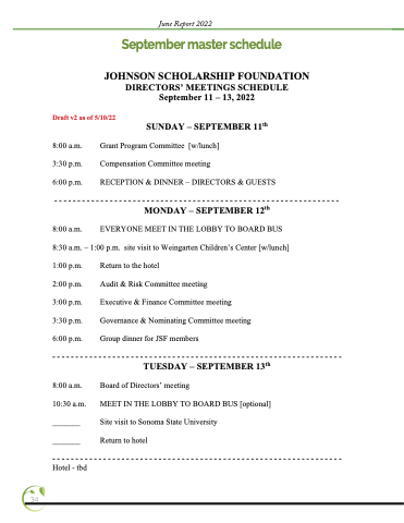 JOHNSON SCHOLARSHIP FOUNDATION DIRECTORS’ MEETINGS SCHEDULE September 11 – 13, 2022