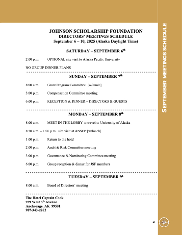 JOHNSON SCHOLARSHIP FOUNDATION DIRECTORS’ MEETINGS SCHEDULE September 6 – 10, 2025 (Alaska Daylight Time)
