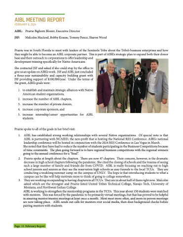 1. AIBL has established strong working relationships with several Native organizations. Of special note is that AIBL is partnering with NCAIED, the non-profit that is hosting the National RES Conference. AIBL’s national leadership conference will be hosted in conjunction with the 2024 RES Conference in Las Vegas in March.