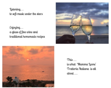 Listening… to soft music under the stars Enjoying… a glass of fine wine and traditional homemade recipes This … is what ‘Mamma Leone' Trattoria Italiana is all about …