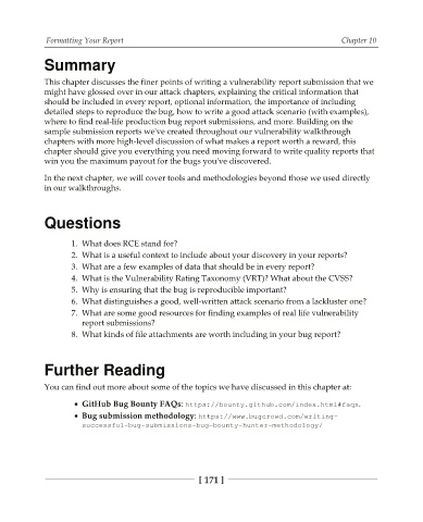 This chapter discusses the finer points of writing a vulnerability report submission that we
