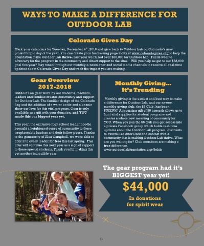 support for the program through ongoing donations, planned giving Outdoor Lab gear worn by our students, teachers,