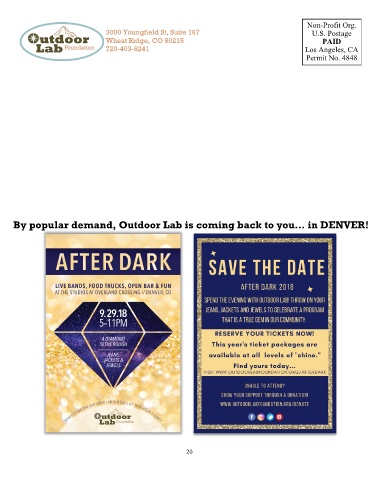Non-Profit Org. 3000 Youngfield St, Suite 167 U.S. Postage Wheat Ridge, CO 80215 PAID 720-403-8241 Los Angeles, CA Permit No. 4848 By popular demand, Outdoor Lab is coming back to you… in DENVER! ANNUAL REPORT 2017-2018 20