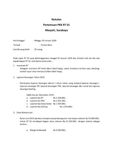 Pada rapat RT 01 yang diselenggarakan tanggal 05 Januari 2020 dan dihadiri oleh ibu-ibu dan