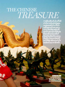 นางแบบสวมชุดกระโปรงยาว คลุมเข่าแขนส้ัน ผ้าไหมพิมพ์ลาย สีแดง พัด ทั้งสองจาก SRETSIS ตุ้มหู จาก EK THONGPRASERT