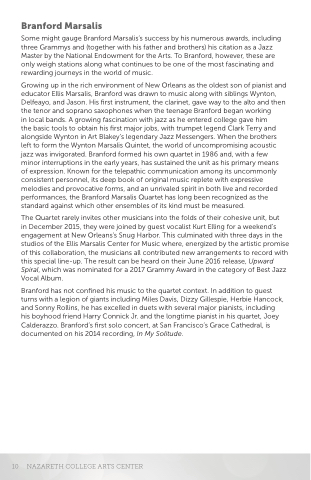 in local bands. A growing fascination with jazz as he entered college gave him the basic tools to obtain his first major jobs, with trumpet legend Clark Terry and alongside Wynton in Art Blakey’s legendary Jazz Messengers. When the brothers left to form the Wynton Marsalis Quintet, the world of uncompromising acoustic jazz was invigorated. Branford formed his own quartet in 1986 and, with a few minor interruptions in the early years, has sustained the unit as his primary means of expression. Known for the telepathic communication among its uncommonly consistent personnel, its deep book of original music replete with expressive melodies and provocative forms, and an unrivaled spirit in both live and recorded performances, the Branford Marsalis Quartet has long been recognized as the standard against which other ensembles of its kind must be measured.