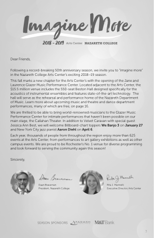 Following a record-breaking 50th anniversary season, we invite you to “imagine more” in the Nazareth College Arts Center’s exciting 2018–19 season.