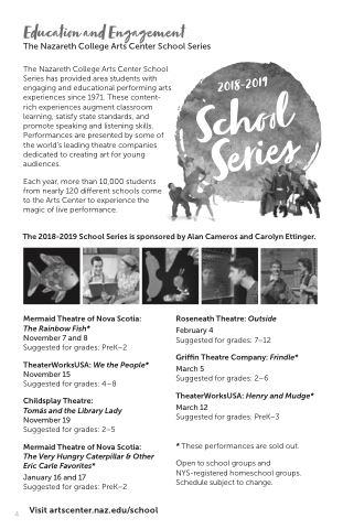 The Nazareth College Arts Center School Series has provided area students with engaging and educational performing arts experiences since 1971. These content- rich experiences augment classroom learning, satisfy state standards, and promote speaking and listening skills. Performances are presented by some of the world’s leading theatre companies dedicated to creating art for young audiences.
