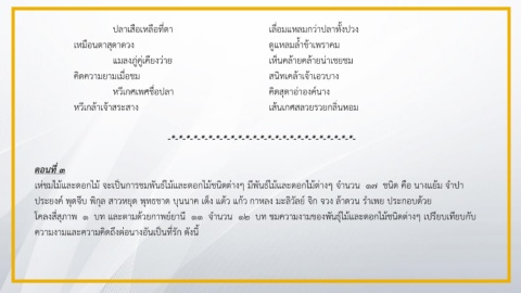 โคลงสี่สุภาพ ๑ บท และตามด้วยกาพย์ยานี ๑๑ จ านวน ๑๒ บท ชมความงามของพันธุ์ไม้และดอกไม้ชนิดต่างๆ เปรียบเทียบกับ