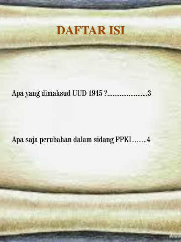 DAFTAR ISI Apa yang dimaksud UUD 1945 ?.......................3 Apa saja perubahan dalam sidang PPKI.........4