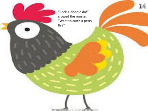 “Cock-a-doodle do!” crowed the rooster. “Want to catch a pesty fly?”