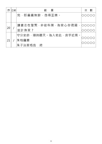 序 日期 範 圍 次 數 完 , 即 囊 橐 無 餘 , 自 得 至 樂 。 ○○○○○ 讀書志在聖賢,非徒科第,為官心存君國, ○○○○○ 20 / 豈計身家? ○○○○○ 守分安命,順時聽天。為人若此,庶乎近焉。 21 / 朱柏廬書 ○○○○○ ○○○○○ 朱子治家格言 終 32