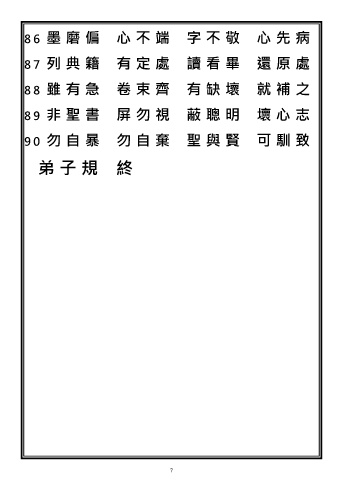 8 6 墨 磨 偏 心 不 端 字 不 敬 心 先 病 8 7 列 典 籍 有 定 處 讀 看 畢 還 原 處 8 8 雖 有 急 卷 束 齊 有 缺 壞 就 補 之 8 9 非 聖 書 屏 勿 視 蔽 聰 明 壞 心 志 9 0 勿 自 暴 勿 自 棄 聖 與 賢 可 馴 致 弟 子 規 終 7