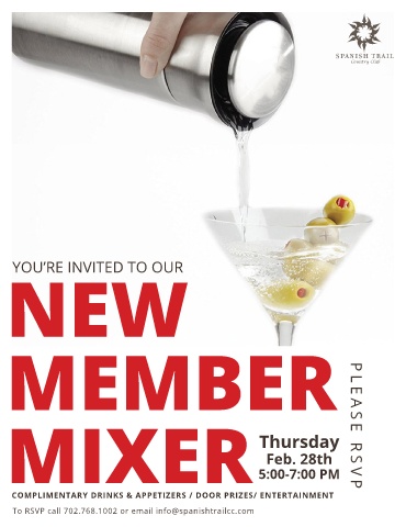 Country Club NEW YOU’RE INVITED TO OUR MEMBER MIXER Thursday PLEASE RSVP Feb. 28th 5:00-7:00 PM COMPLIMENTARY DRINKS & APPETIZERS / DOOR PRIZES/ ENTERTAINMENT To RSVP call 702.768.1002 or email info@spanishtrailcc.com