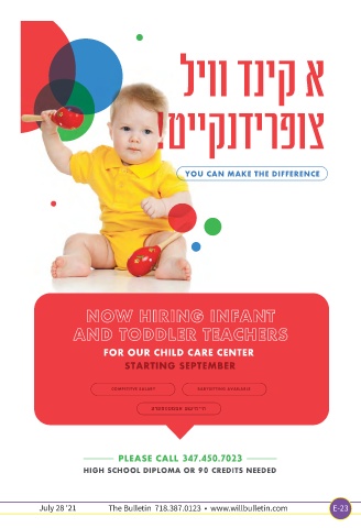 YOU CAN MAKE THE DIFFERENCE FOR OUR CHILD CARE CENTER STARTING SEPTEMBER COMPETITVE SALARY BABYSITTING AVAILABLE PLEASE CALL 347.450.7023 HIGH SCHOOL DIPLOMA OR 90 CREDITS NEEDED