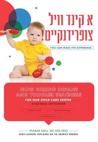 YOU CAN MAKE THE DIFFERENCE FOR OUR CHILD CARE CENTER STARTING SEPTEMBER COMPETITVE SALARY BABYSITTING AVAILABLE PLEASE CALL 347.450.7023 HIGH SCHOOL DIPLOMA OR 90 CREDITS NEEDED
