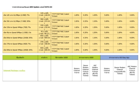 เนต 120 บาท UL1Mbps (2.5GB) 7วัน (+vat =128.40 *777*7357*ASC Code# 1.85% 0.35% 1.50% 5.00% 1.00% 4.00%