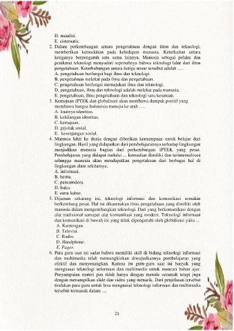 E. pengetahuan, ilmu pengetahuan dan teknologi satu kesatuan.