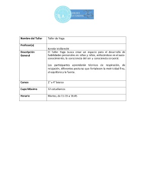 Descripción El Taller Yoga busca crear un espacio para el desarrollo de