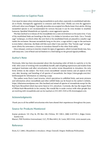 The author owns Davis Lund Aviaries, which specializes in softbilled birds, and more pictures