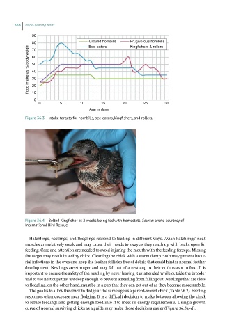 Figure 36.4 Belted Kingfisher at 2 weeks being fed with hemostats. Source: photo courtesy of