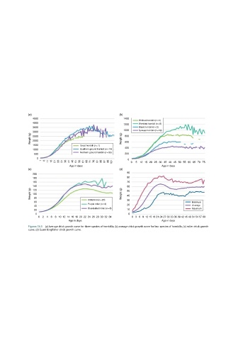 Figures 36.5 (a) Average chick growth curve for three species of hornbills; (b) average chick growth curve for four species of hornbills; (c) roller chick growth