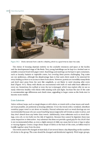 Figure 39.3 Chicks removed from crate for a feeding, which is a good time to clean the crate.