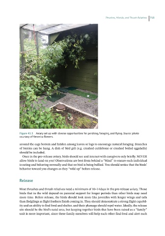 Most thrushes and thrush relatives need a minimum of 10–14 days in the pre‐release aviary. Those