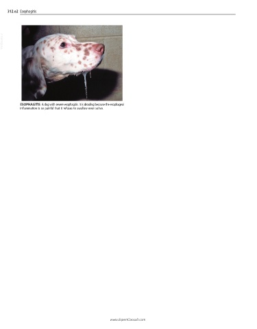 312.e2 Esophagitis VetBooks.ir ESOPHAGITIS A dog with severe esophagitis. It is drooling because the esophageal inflammation is so painful that it refuses to swallow even saliva. www.ExpertConsult.com