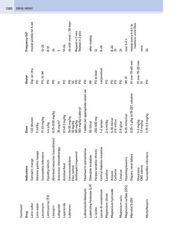 Continued Drug Lime sulfur Lime water Lincomycin Liothryonine (T3) Lisinopril Lobaplatin Loperimide Lufeneron Lufeneron/milbemycin Luteinizing hormone (LH) L-lysine Lysine-8–vasopressin Magnesium citrate Magnesium hydroxide Magnesium salts Magnesium sulfate (25%) Mannitol 5–20% Marbofloxacin