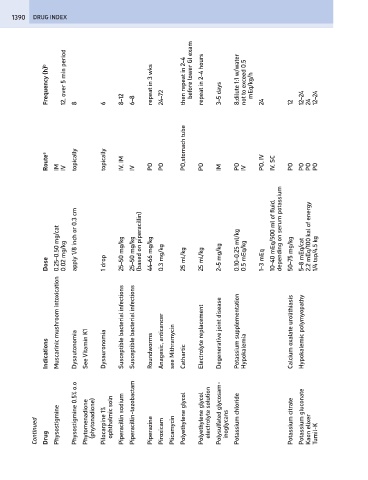 Continued Drug Physostigmine Physostigmine 0.5% o.o Phytomenadione (phytonadione) Pilocarpine 1% ophthalmic soln Piperacillin sodium Piperacillin-tazobactam Piperazine Piroxicam Plicamycin Polyethylene glycol Polyethylene glycol electrolyte solution Polysulfated glycosam- inoglycans Potassium chloride Potassium citrate Potassium gluconate Kaon elixer Tumil-K