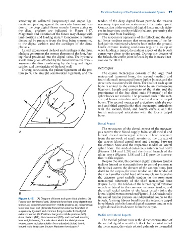 Figure 1.17. (A) Diagram of forces acting on distal phalanx. (1) fetlock. A strong fibrous band from the accessory carpal