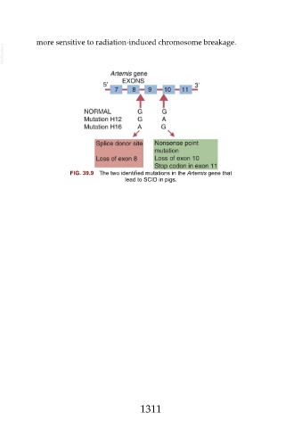 more sensitive to radiation-induced chromosome breakage. VetBooks.ir FIG. 39.9 The two identified mutations in the Artemis gene that lead to SCID in pigs. 1311