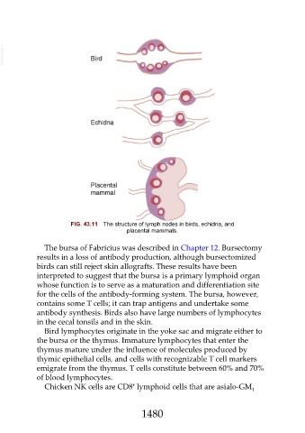 FIG. 43.11 The structure of lymph nodes in birds, echidna, and