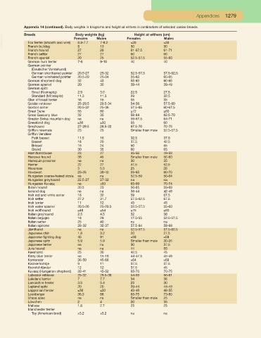 Appendix 14 (continued). Body weights in kilograms and height at withers in centimeters of selected canine breeds.