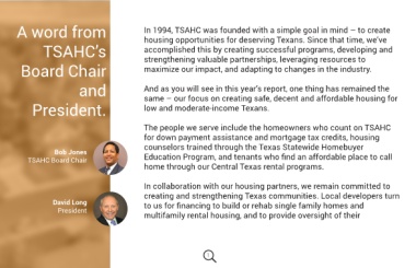 President. low and moderate-income Texans. To our dedicated partners and to those we serve, you can rest assured our focus will continue to be to