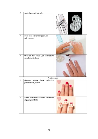 2. Alat : kuas nail art:palet 3. Bersihkan kuku menggunakan nail remover 4. Oleskan base coat agar warnadapat melekatlebih lama Pelakasanaan 1. Oleskan warna dasar padakuku, yakni merah jambu 2. Untuk menerapkan desain tempelkan stipper psds kuku 41