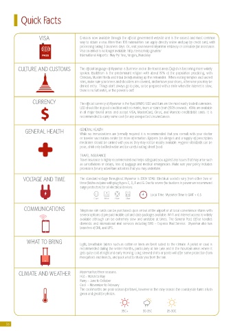 VOLTAGE AND TIME The standard voltage throughout Myanmar is 230V 50Hz. Electrical sockets vary from either two or