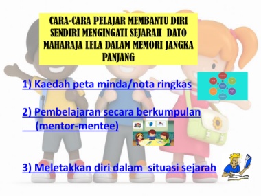 CARA-CARA PELAJAR MEMBANTU DIRI SENDIRI MENGINGATI SEJARAH DATO MAHARAJA LELA DALAM MEMORI JANGKA PANJANG 1) Kaedah peta minda/nota ringkas 2) Pembelajaran secara berkumpulan (mentor-mentee) 3) Meletakkan diri dalam situasi sejarah