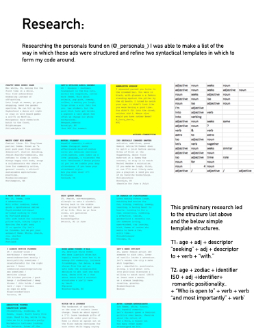 Researchingthepersonalsfoundon(@_personals_)Iwasabletomakealistofthe wayinwhichtheseadswerestructuredandrefinetwosyntacticaltemplatesinwhichto form mycodearound.