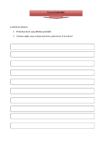 TUGAS INDIVIDU LANGKAH KERJA: 1. Perhatikan kartu yang diberkan pendidik! 2. Tuliskan angka yang terdapat pada kartu pada kolom di bawah ini!