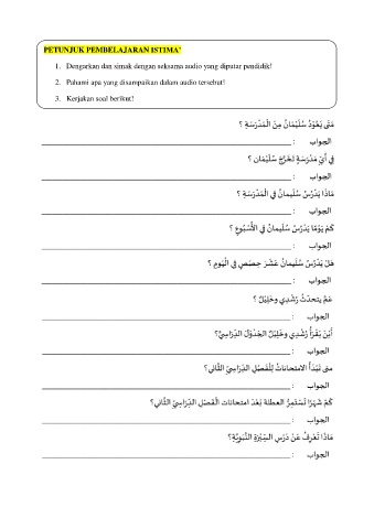 PETUNJUK PEMBELAJARAN ISTIMA’ 1. Dengarkan dan simak dengan seksama audio yang diputar pendidik! 2. Pahami apa yang disampaikan dalam audio tersebut! 3. Kerjakan soal berikut!