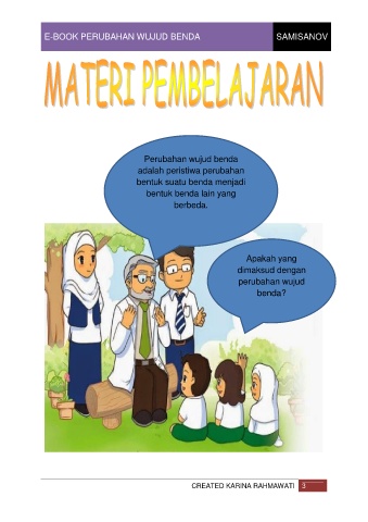 E-BOOK PERUBAHAN WUJUD BENDA SAMISANOV Perubahan wujud benda adalah peristiwa perubahan bentuk suatu benda menjadi bentuk benda lain yang berbeda. Apakah yang dimaksud dengan perubahan wujud benda? CREATED KARINA RAHMAWATI 3